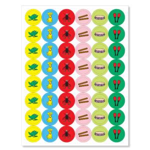Sunrise sticker sheet with castanet and drum instruments, Piano, Forte, Decrescendo symbols.